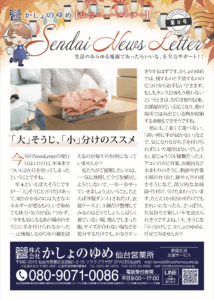 かしょのゆめの「Sendai News Letter」は隔月に発行され、かしょのゆめ仙台地域の情報をお伝えしています。9月号の掲載は▷かしょのゆめで働く私たちの想い ▷かしょのゆめ仙台営業所コラム「いろいろなチャンネルでお待ちしています」です。仙台地域でポスティングにてお配りしています。ぜひご覧ください。